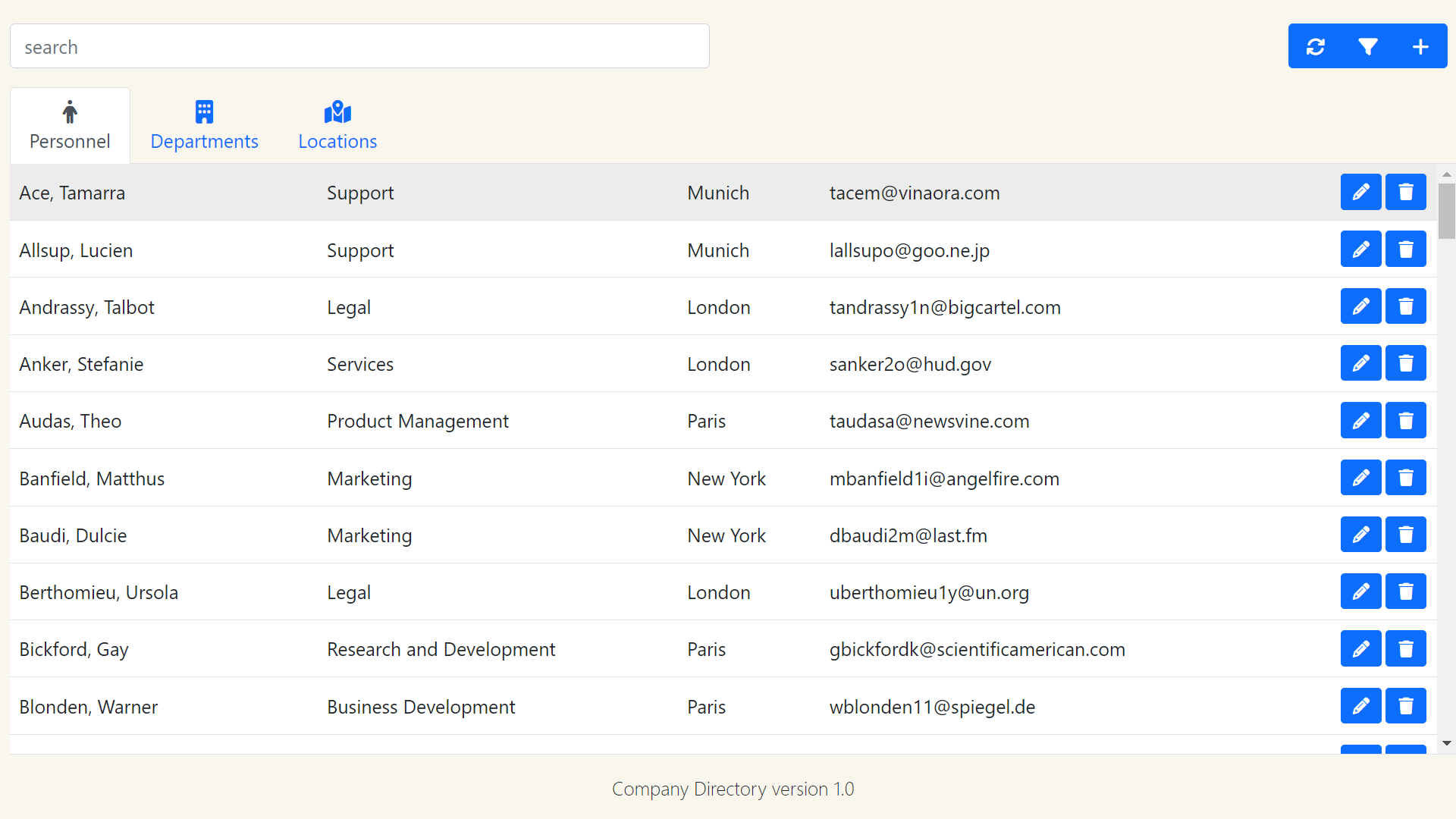 Mobile-first app that allows the user to search and manipulate a database securely using CRUD functionality providing the user the ability to add, delete, or edit personnel, departments, or locations with the filter option.